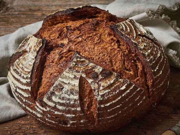Pumpernickle is a slightly sweet, dense rye bread made with sourdough starter and coarsely ground rye flour and grains. It’s rich and tasty and the “boule” (“ball” in French) version makes a perfect dip bowl when hollowed out. Try it with your favourite Spinach Dip recipe! (390 grams)