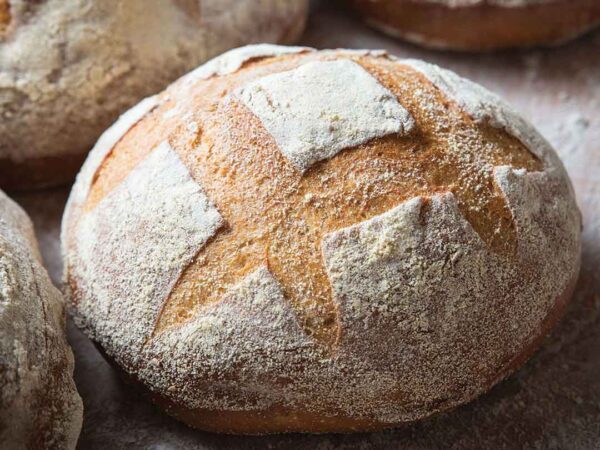 Sourdough is a slightly sour, dense white bread with a chewy crust. Our sourdough “boule” (“ball” in French) is an ideal dip bowl when hollowed out. A favourite anytime of the year! (390 grams)